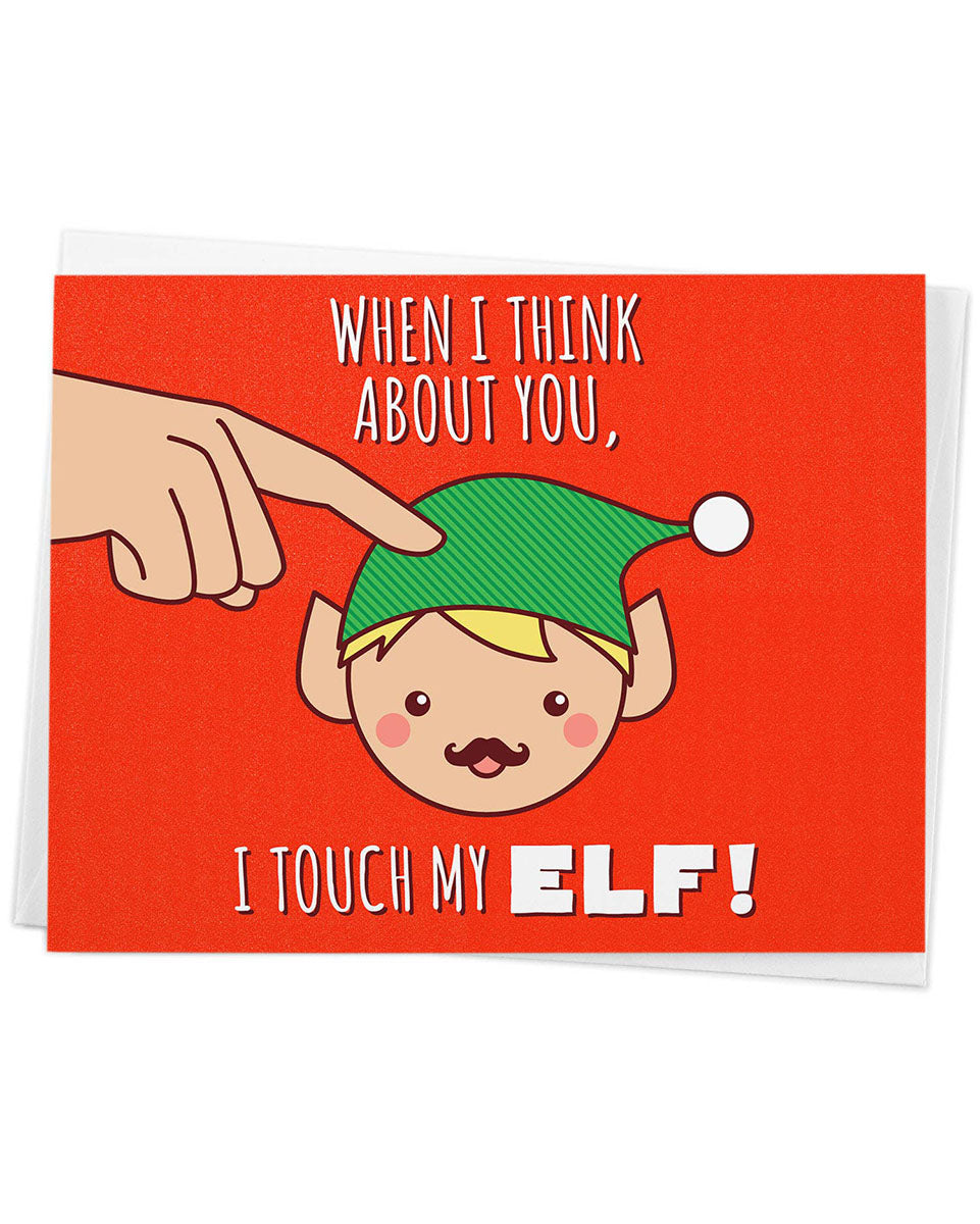 "When I Think About You I ..." Touch My Elf Naughty Pun Christmas Holiday Greeting Card - 4.25" x 5.5"